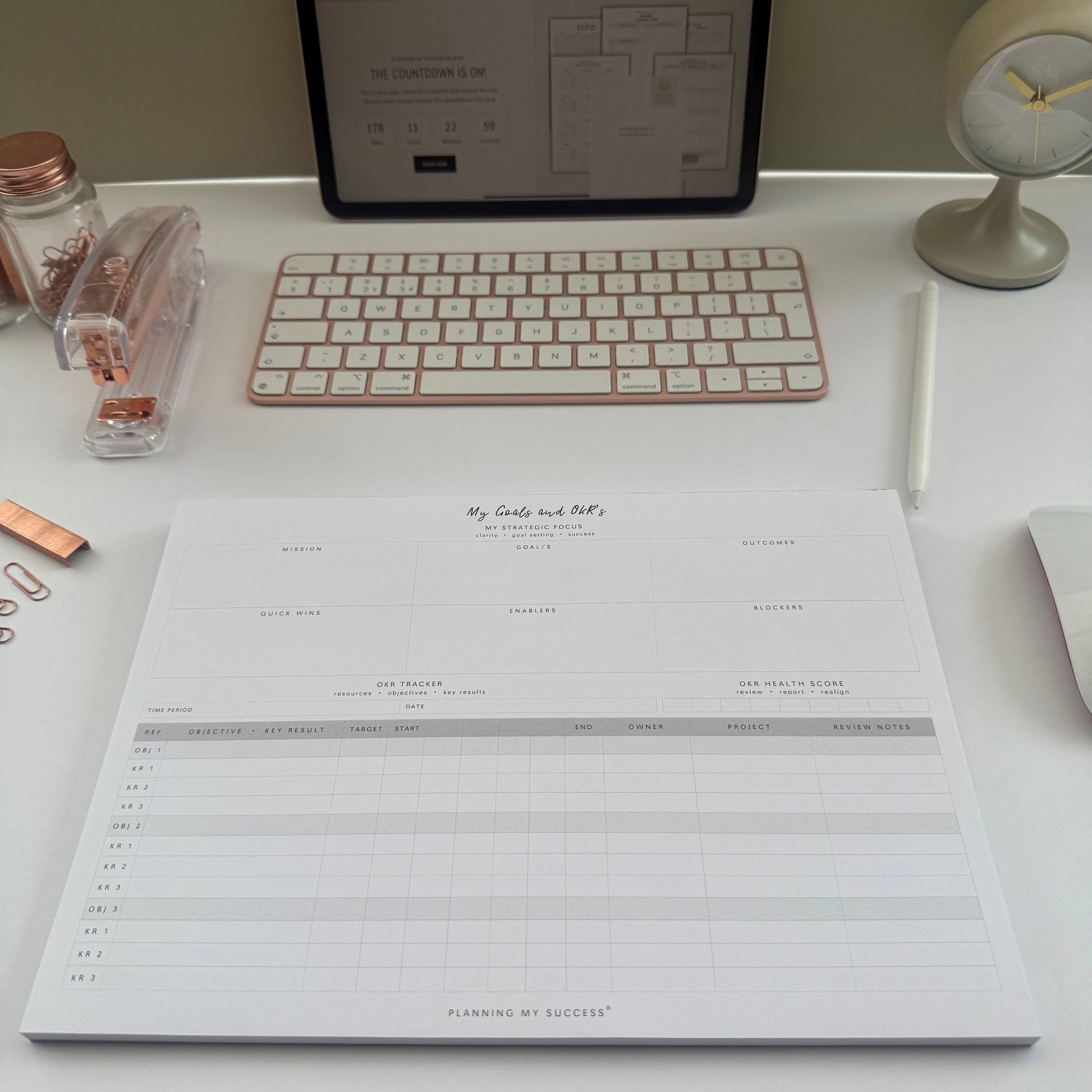 Set out your strategic focus with the PRINTABLE My Goals and OKR's - A4 Desk Pad.